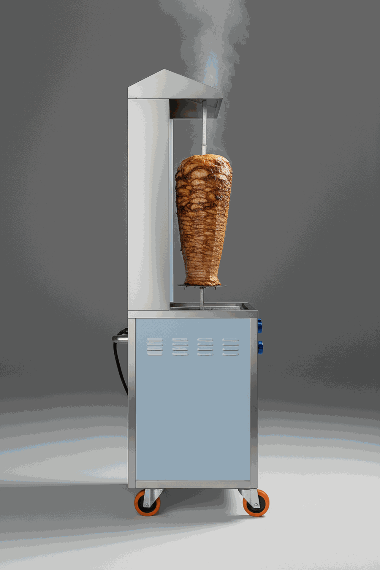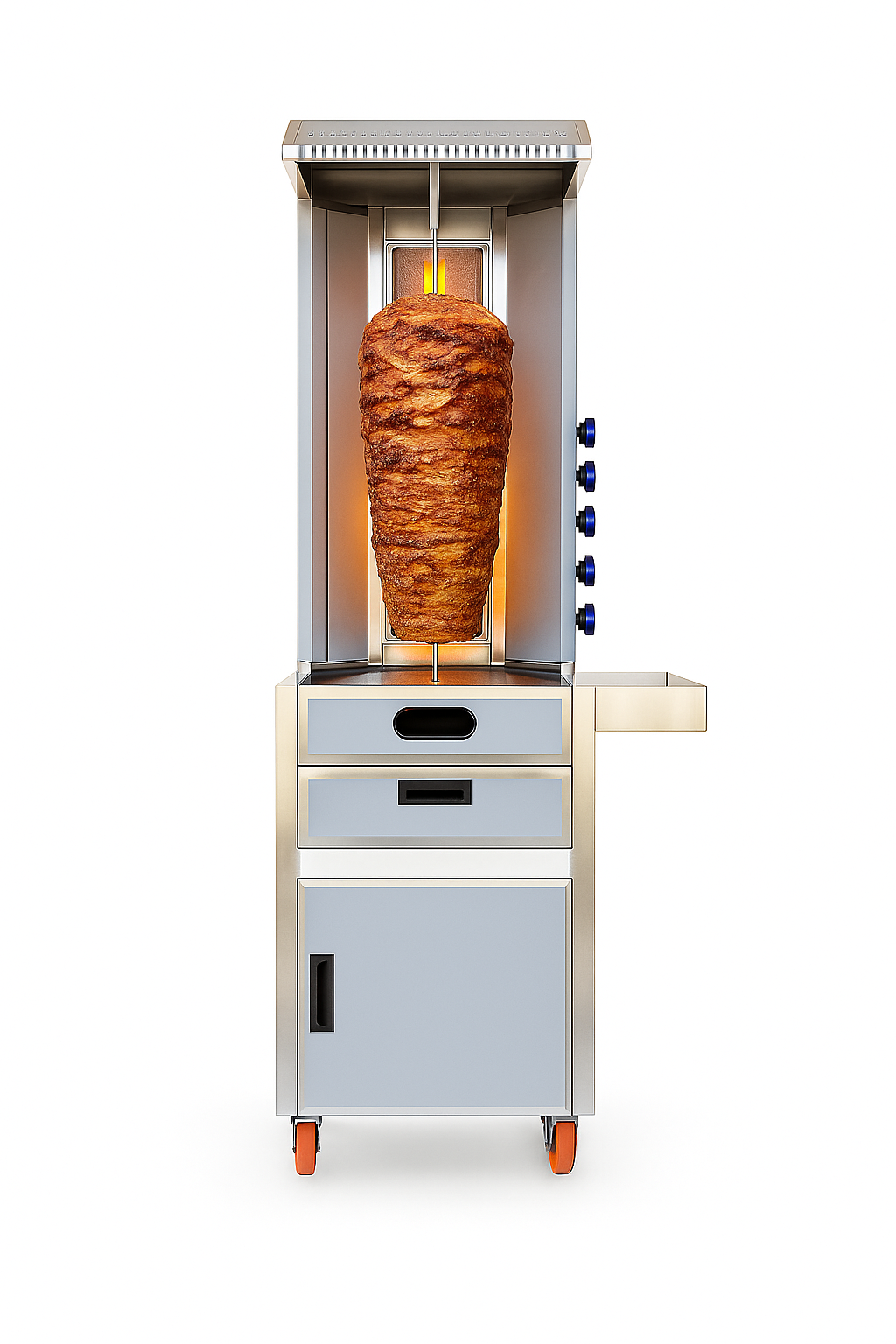 - نظام التحكم: مزودة بلوحة تحكم مرنة تسمح بتدوير سيخ الشاورما بشكل متوازن ومتساوٍ